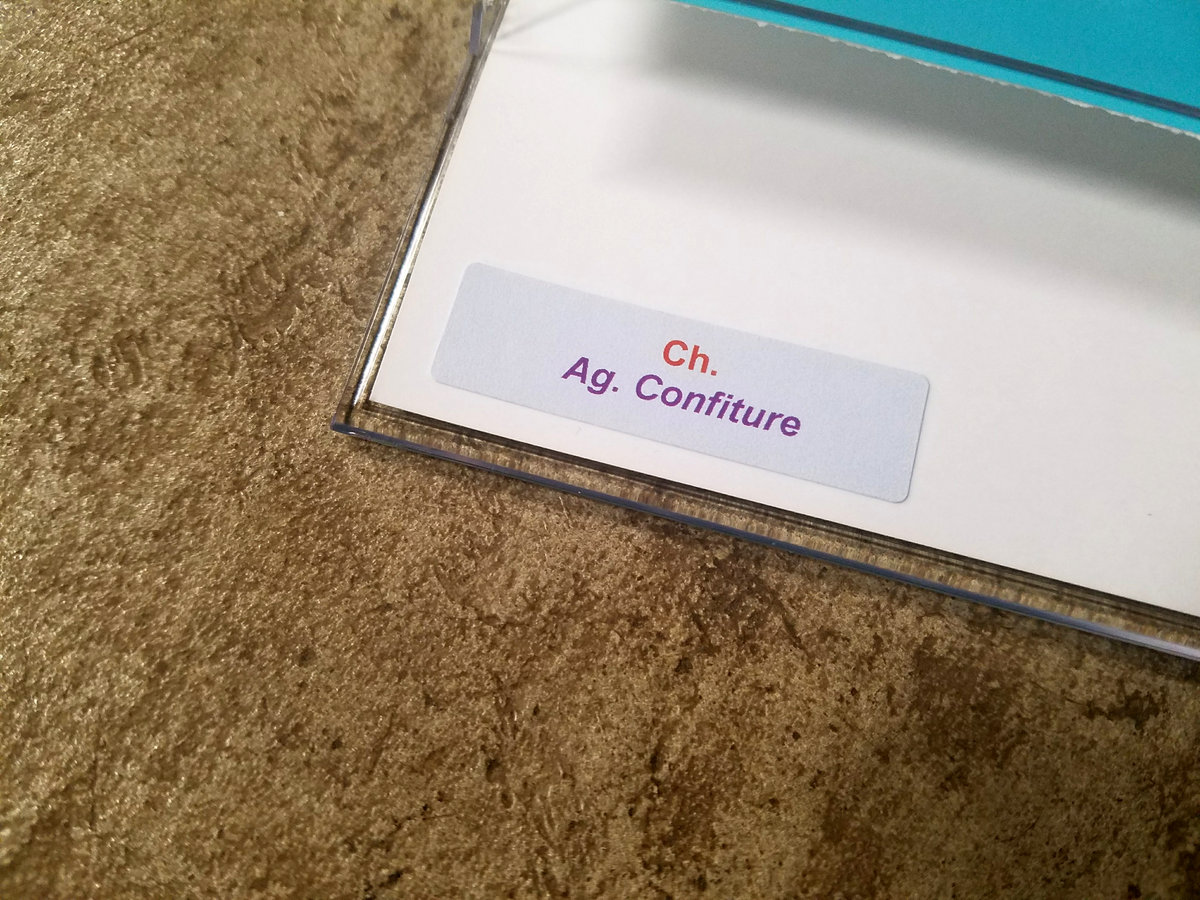 Packaged in an almost-clear soft poly case with a glossy rectangular photographic print insert and custom text sticker work, with a black ninety-minute cassette tape bearing red side labels with black text, dubbed one copy at a time on a JVC KD-A11 stereo deck from 16/441 wavfile masters on a Fiio X5. Includes the bonus A-side track "Ag. Confiture [Allotropism]" clocking in at 15:47. All ten patrons who pick up this cassette will have a digital copy of this bonus track emailed to them :)