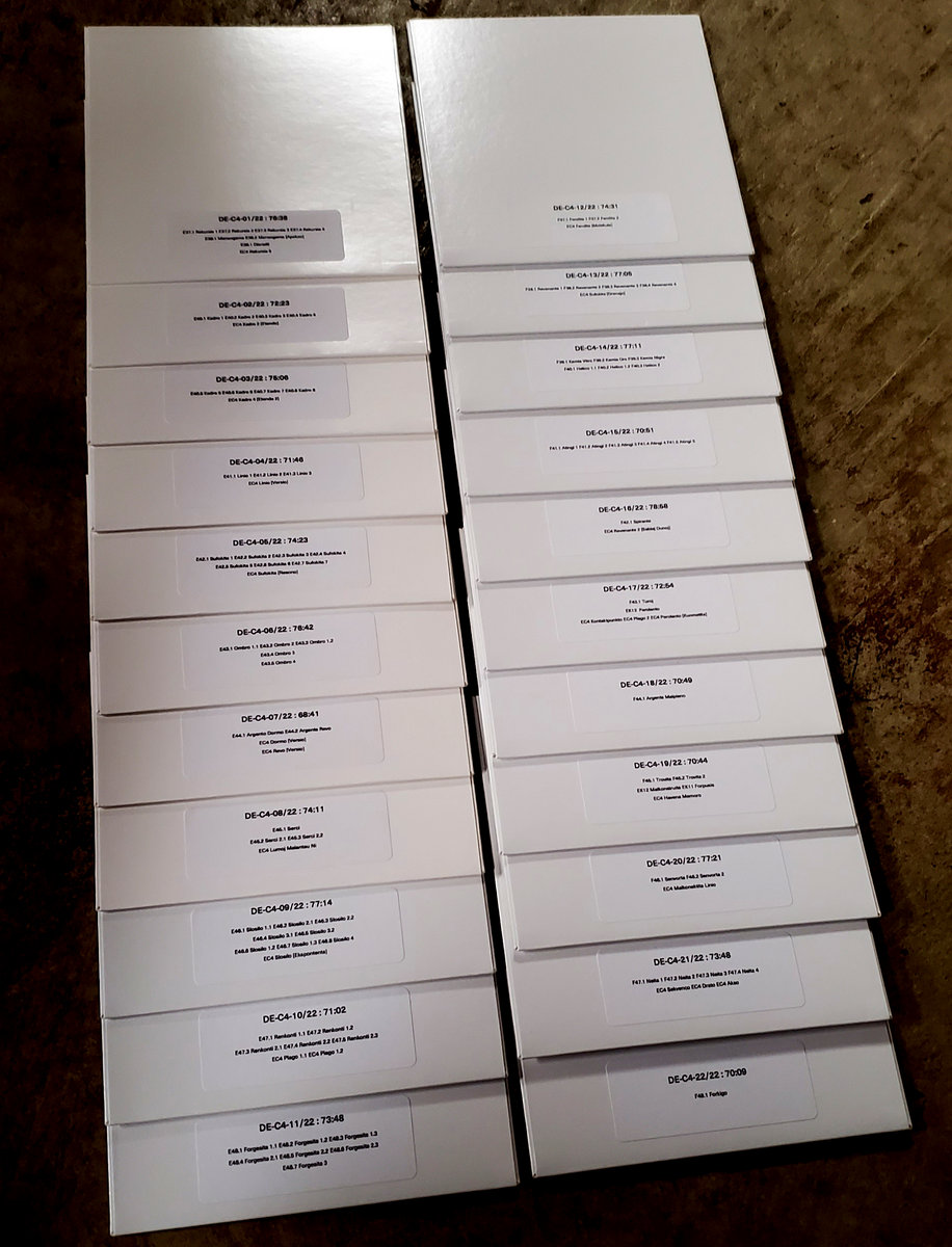 Assembled by hand, one copy at a time, in the White Pillar Workshop! Twenty-two white 5" recordable discs, housed inside twenty-two white die-cut cardboard jackets, each with their own 4x5" glossy photographic print insert and custom text sticker on the back cover. All twenty-two discs are contained inside a white lidded box, which itself bears the Deep Earth sigil on the outside and a catalog info sticker on the inside of the lid. Over 27 hours of audio await you, across 109 tracks - including 22 tracks / 5+ hours of previously unreleased material! *NOTE* Due to the size of this box and the time and materials needed to create one, orders for DE-C4 will take longer than usual to fulfill. Your patience is appreciated.