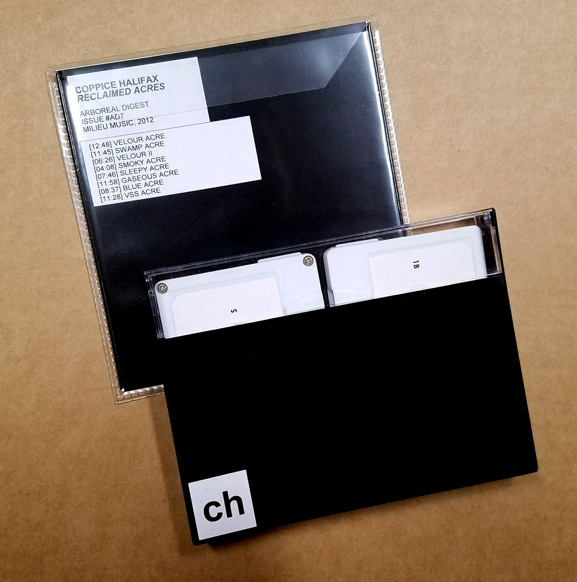 A single copy Ashcan Edition of Reclaimed Acres, including the two master cassette tapes used for dubbing the [AB-AT] Analog Botany 10xCassette Binder Sets, which are being venerated and retired here due to some audio degradation on the tracks Vapor Acre / VSS Acre. The cassettes contain an expanded version of the Reclaimed Acres album, designed only for four sides of tape in the AB-AT set. This Ashcan Edition set also includes a standard CD-R copy of Reclaimed Acres. Both tapes are housed in a special oversized black-and-clear plastic norelco case with custom CH stickers affixed on both sides.