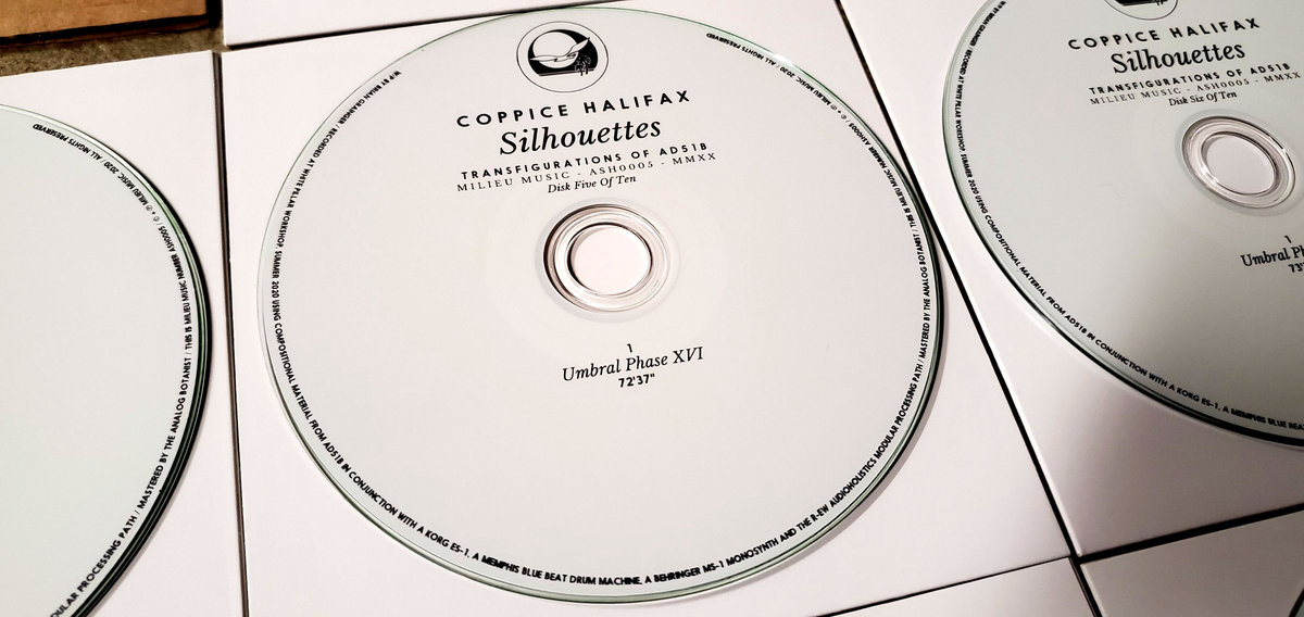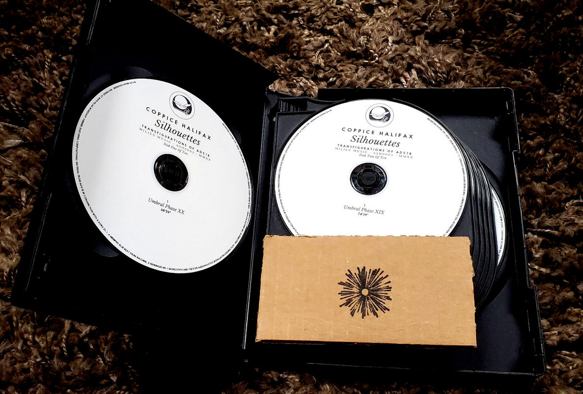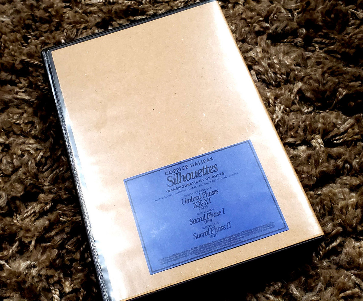 All ten discs of the bagged edition of SILHOUETTES, contained in a thick black plastic case, with a wraparound recycled cardstock insert bearing two deep blue printed cardstock panels on the front and back cover, and a hand-cut rugged cardboard "faceplate" that sits inside the case, hand-stamped with the CH sun logo in black ink, with hand-numbering and the artist's signature on the back. Also includes TWO bonus CD-Rs not available in any other edition - SACRAL PHASE I (68:39) and SACRAL PHASE II (62:20) - totaling over 14 HOURS of deep Halifaxian interior landscaping!