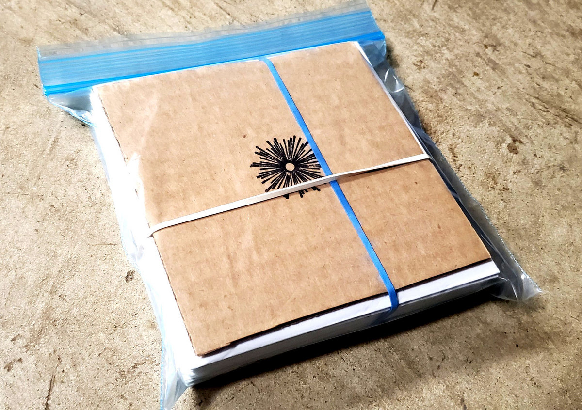 Assembled by hand, one copy at a time, in the White Pillar Workshop. Ten (10) white 5" recordable discs, duplicated and printed via an Imation D20, held securely inside individual white cardboard jackets with black text/white labels on the front covers. All ten discs are held together in a stack by two colored rubberbands and placed inside a ziplock bag that comes in one of five different colors. A rugged cardboard "faceplate" is also stamped, numbered and signed by the artist, to be placed on the top of the 10xCD-R stack.