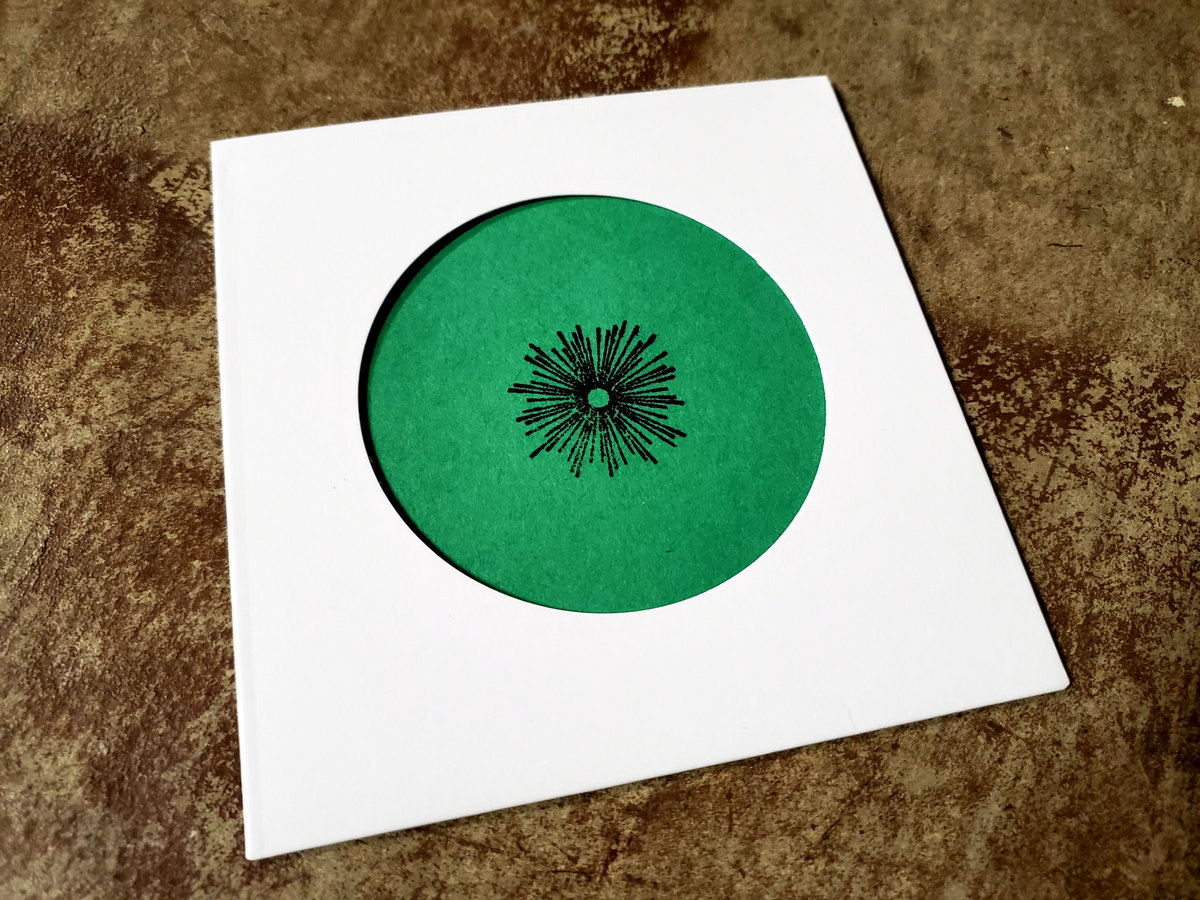 Assembled by hand, one copy at a time, in the White Pillar Workshop. One white 5" compact-disc recordable, printed and duplicated via an Imation D20, held securely inside a white or black die-cut paperboard jacket, with a custom text label on the back cover and a hand-stamped green cardstock cover insert bearing the CH sun logo in black. Ships inside a clear cast-polypropylene sleeve with a flap to ensure your new sonic artifact remains dust and moisture-free.